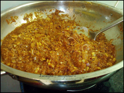 - Letak lasagna yang belum direbus sekeping didalam bekas, pastikan ianya memenuhi ruangan bekas, patah-patahkan lasagna . Boleh juga kalau nak rebus, but my style tak rebus.